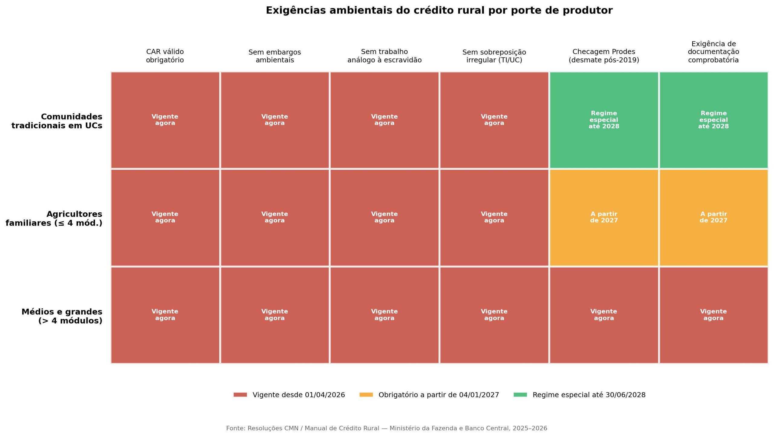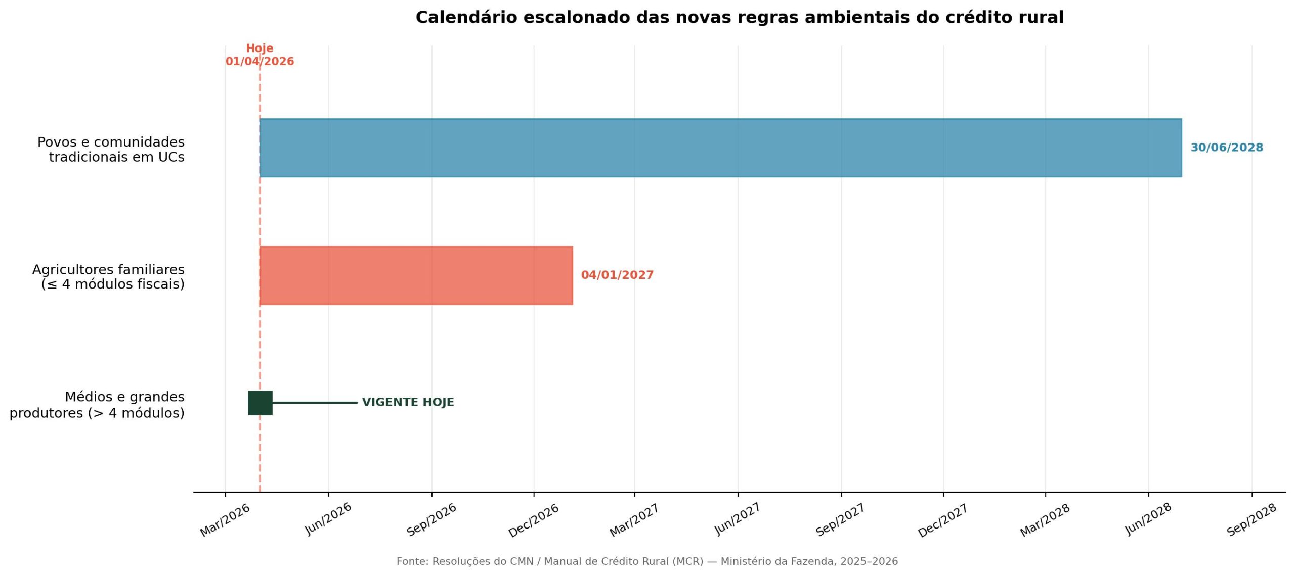 A partir desta quarta-feira, 1º de abril de 2026, médios e grandes produtores rurais com imóveis acima de quatro módulos fiscais só terão acesso a crédito rural com juros controlados se passarem por uma checagem obrigatória de desmatamento por satélite. As alterações no Manual de Crédito Rural, aprovadas pelo Conselho Monetário Nacional, obrigam os bancos a consultar os sistemas Prodes e BiomasBR antes de liberar qualquer financiamento para esse perfil de propriedade. Para a agricultura familiar, a mesma exigência começa a valer apenas em 4 de janeiro de 2027.