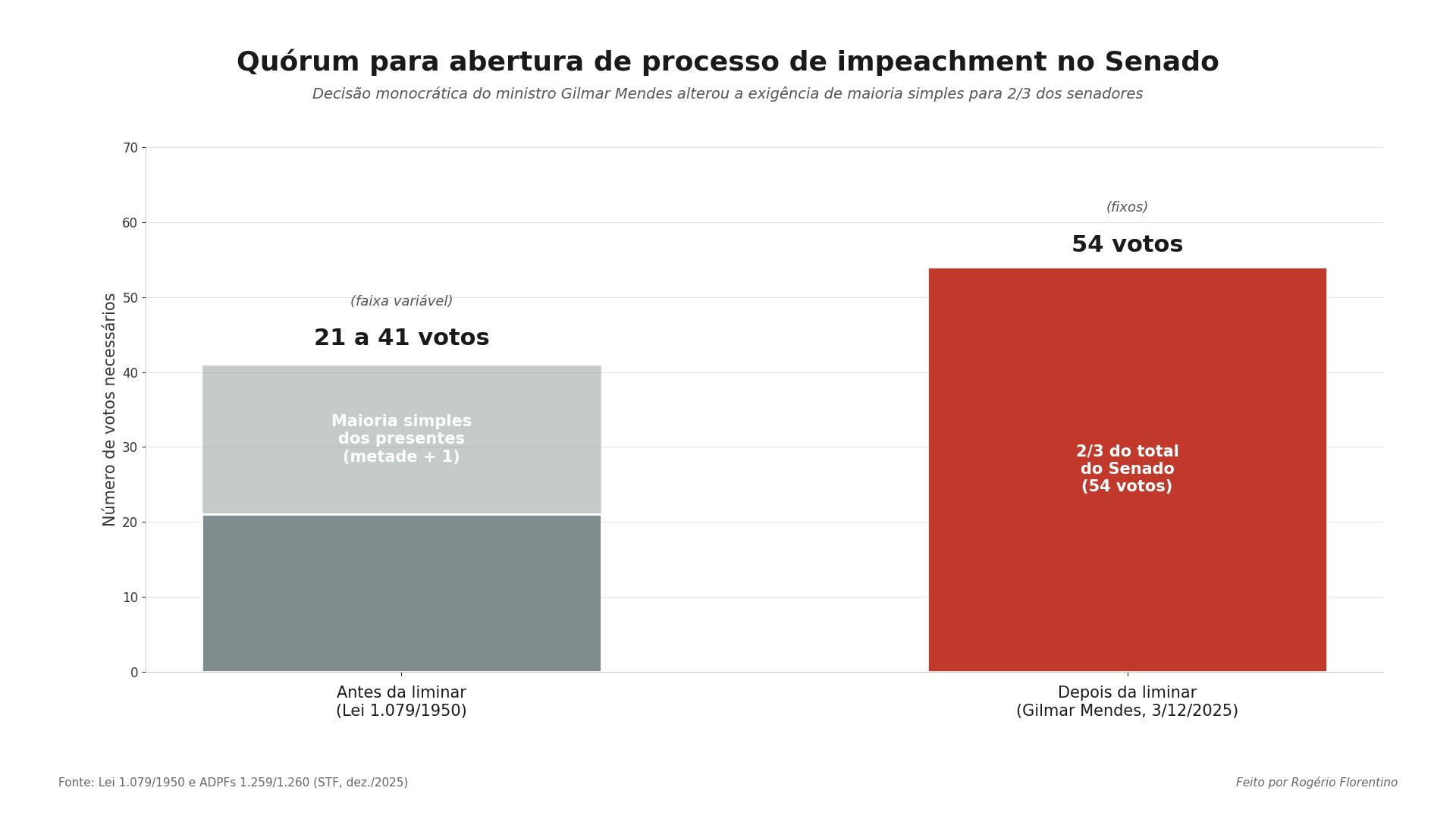 A liminar de 3 de dezembro, ainda que parcialmente suspensa, adiciona três barreiras: 54 votos para a mera admissibilidade, vedação ao afastamento automático do ministro com o recebimento da denúncia e impossibilidade de se embasar denúncia apenas no conteúdo de votos.
