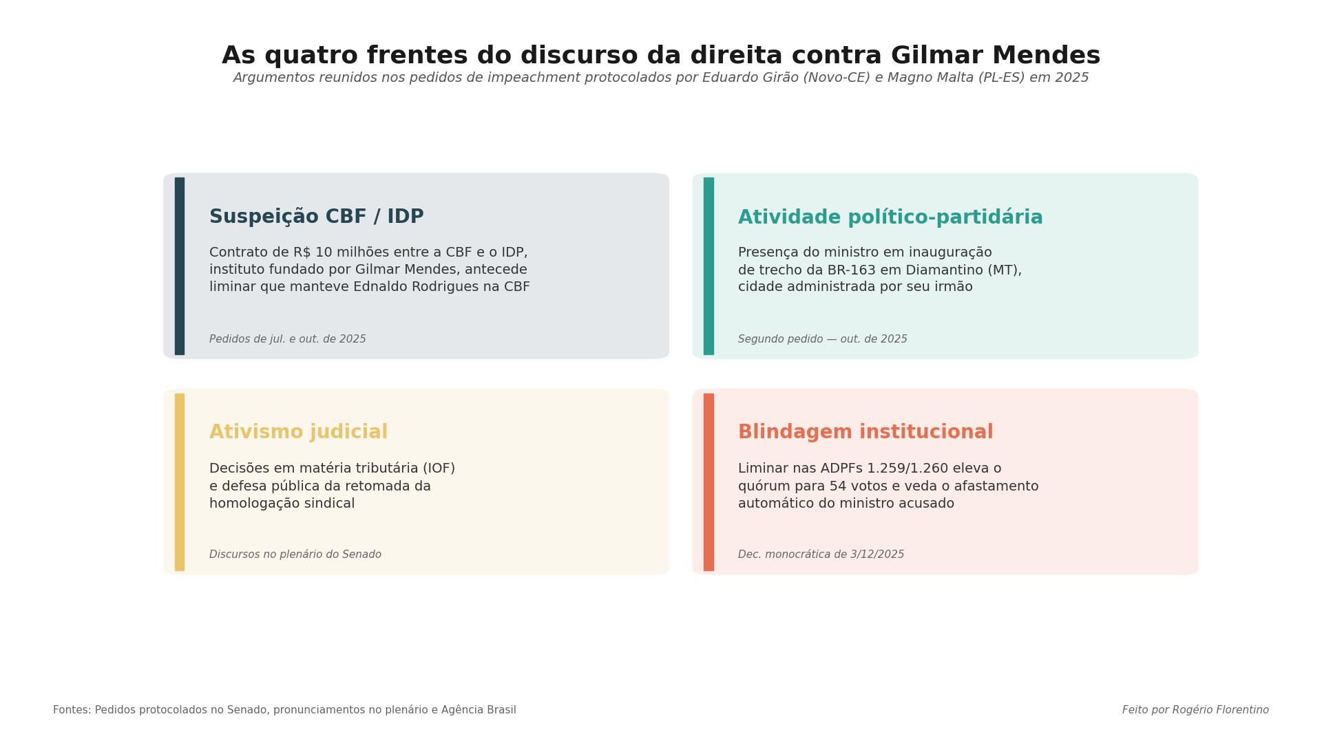 Os pedidos reúnem três acusações: suspeição em casos relacionados à CBF, conflito de interesse ligado ao IDP e participação em eventos de caráter político. Em dezembro de 2025, Gilmar Mendes assinou liminar que elevou o quórum de admissibilidade para dois terços dos senadores, ponto que, a partir de 2026, passou a ser citado pela oposição como nova evidência do que chama de “autoblindagem” do Supremo.
