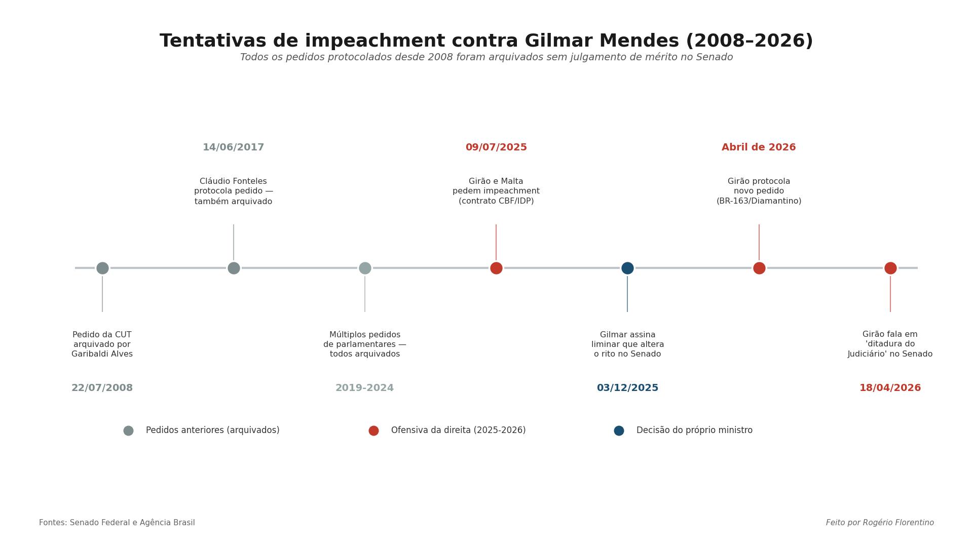 A Assessoria de Imprensa do Senado registrou em nota de setembro de 2024 que “nunca foi aprovado um pedido de impeachment contra ministro do STF”. Os protocolos contra Gilmar Mendes remontam a 2008, com iniciativas de centrais sindicais e juristas; os pedidos de 2025 e 2026 partiram de parlamentares de direita.