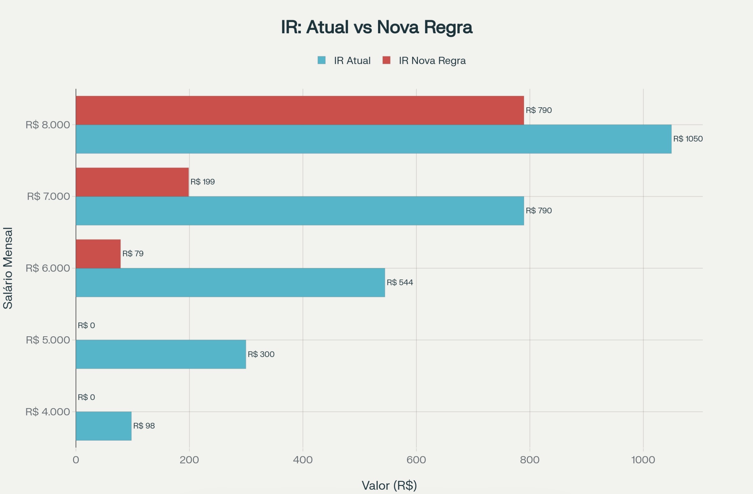A nova legislação, se sancionada, altera drasticamente o cenário para a classe média. Atualmente, a isenção do imposto alcança apenas quem tem rendimentos de até R$ 3.036 por mês. Com a aprovação, 10 milhões de pessoas deixarão de pagar o tributo completamente, enquanto outros 6 milhões se beneficiarão de um novo sistema de descontos parciais.