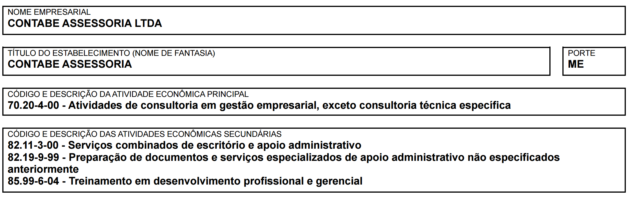 O CNAE principal: 70.20-4-00 (Atividades de consultoria em gestão empresarial), também não qualifica a empresa para realizar serviços de contabilidade pública propriamente ditos, como o fechamento de balanços ou a responsabilidade técnica pelas contas de um órgão.