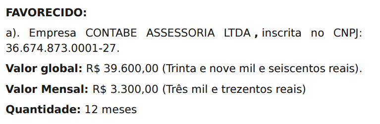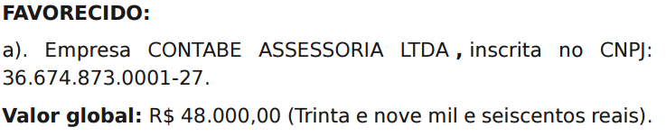Um dos pontos críticos é uma divergência flagrante no Extrato de Dispensa Nº 005/2026. O texto registra: “Valor global: R$ 48.000,00 (Trinta e nove mil e seiscentos reais).” O valor escrito por extenso é exatamente o montante do outro contrato da empresa (o de contabilidade), o que reforça a tese de que os documentos foram fabricados de forma apressada.