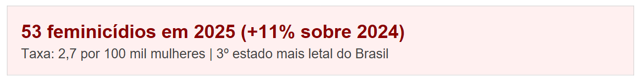 Dados do Fórum Brasileiro de Segurança Pública revelam que o estado registrou 53 feminicídios em 2025, alta de 11% sobre o ano anterior, e mantém a terceira maior taxa do país. Especialistas apontam deserto de proteção institucional e normalização cultural da violência doméstica como fatores estruturais.