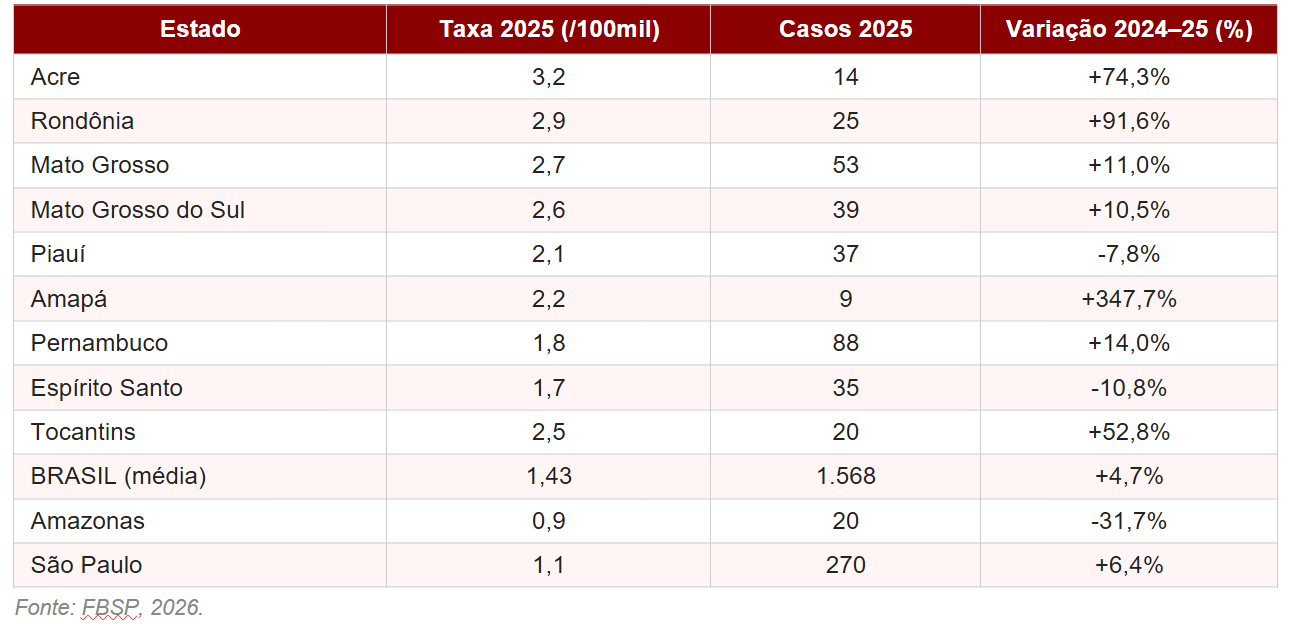 Esta matéria é fundamentada no relatório ‘Retrato dos Feminicídios no Brasil’, publicado pelo Fórum Brasileiro de Segurança Pública em março de 2026. Os dados de feminicídio provêm de boletins de ocorrência das Polícias Civis de todo o país e do Sistema Nacional de Informações de Segurança Pública (Sinesp/MJSP). As taxas são calculadas por 100 mil mulheres com base em estimativas populacionais do IBGE. Os dados de perfil das vítimas (2021–2024) provêm da análise de microdados de registros policiais. Dados de 2025 referem-se apenas a totais absolutos e taxas; dados de perfil para 2025 serão publicados no próximo Anuário Brasileiro de Segurança Pública. Para Mato Grosso, os dados sobre MPU são referentes a janeiro–junho de 2023.