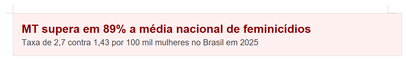 O relatório revela ainda que os pequenos municípios — com até 100 mil habitantes — são residência de 41% da população feminina do país, mas concentram 50% dos feminicídios. Cidades com até 20 mil habitantes apresentam taxa de 1,8 por 100 mil, 28,5% acima da média nacional. Em Mato Grosso, onde boa parte das cidades se encaixa nesse perfil, o dado é especialmente preocupante.